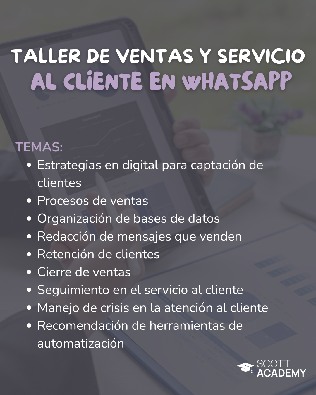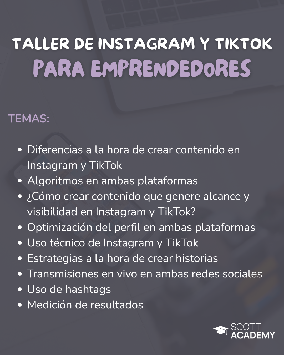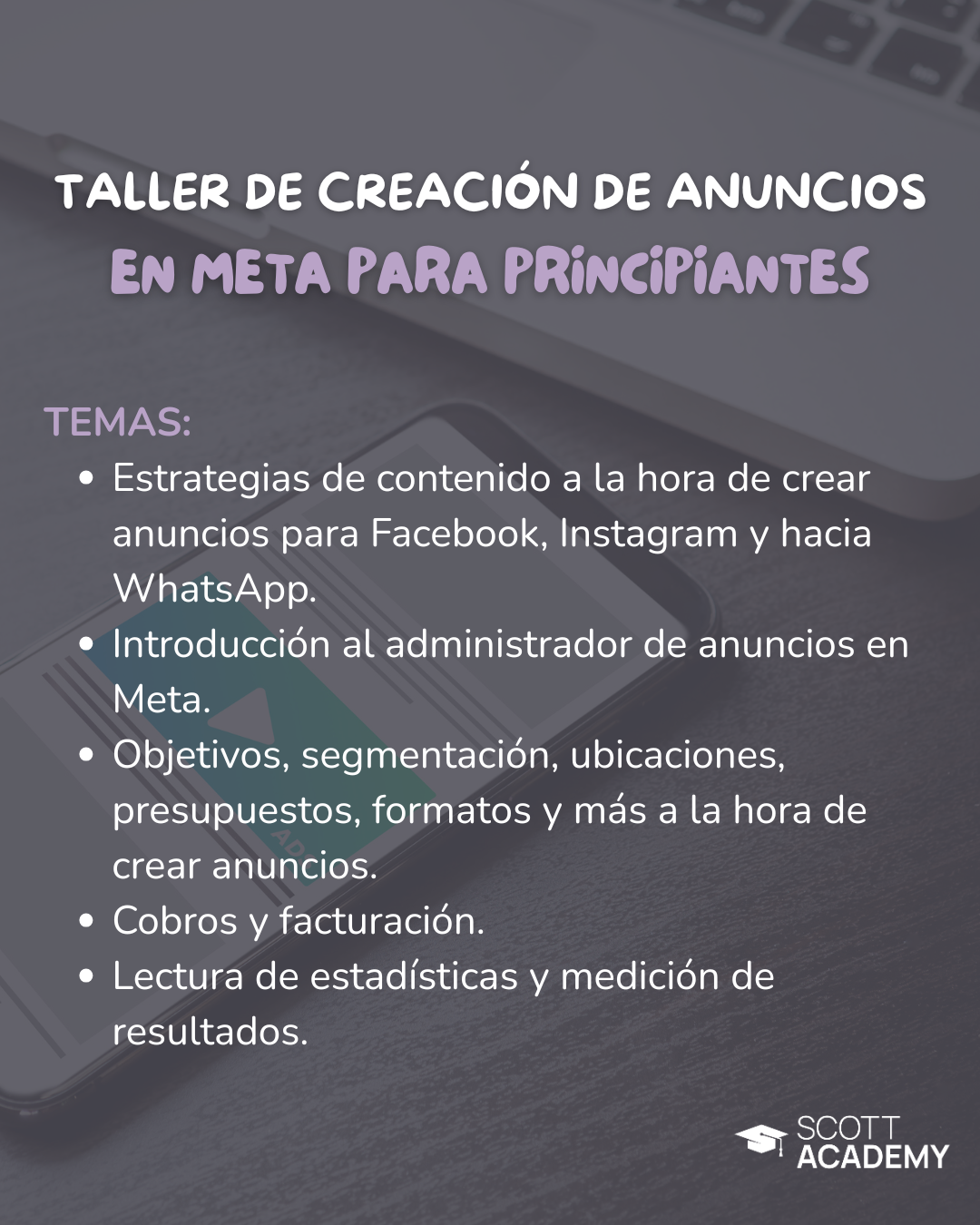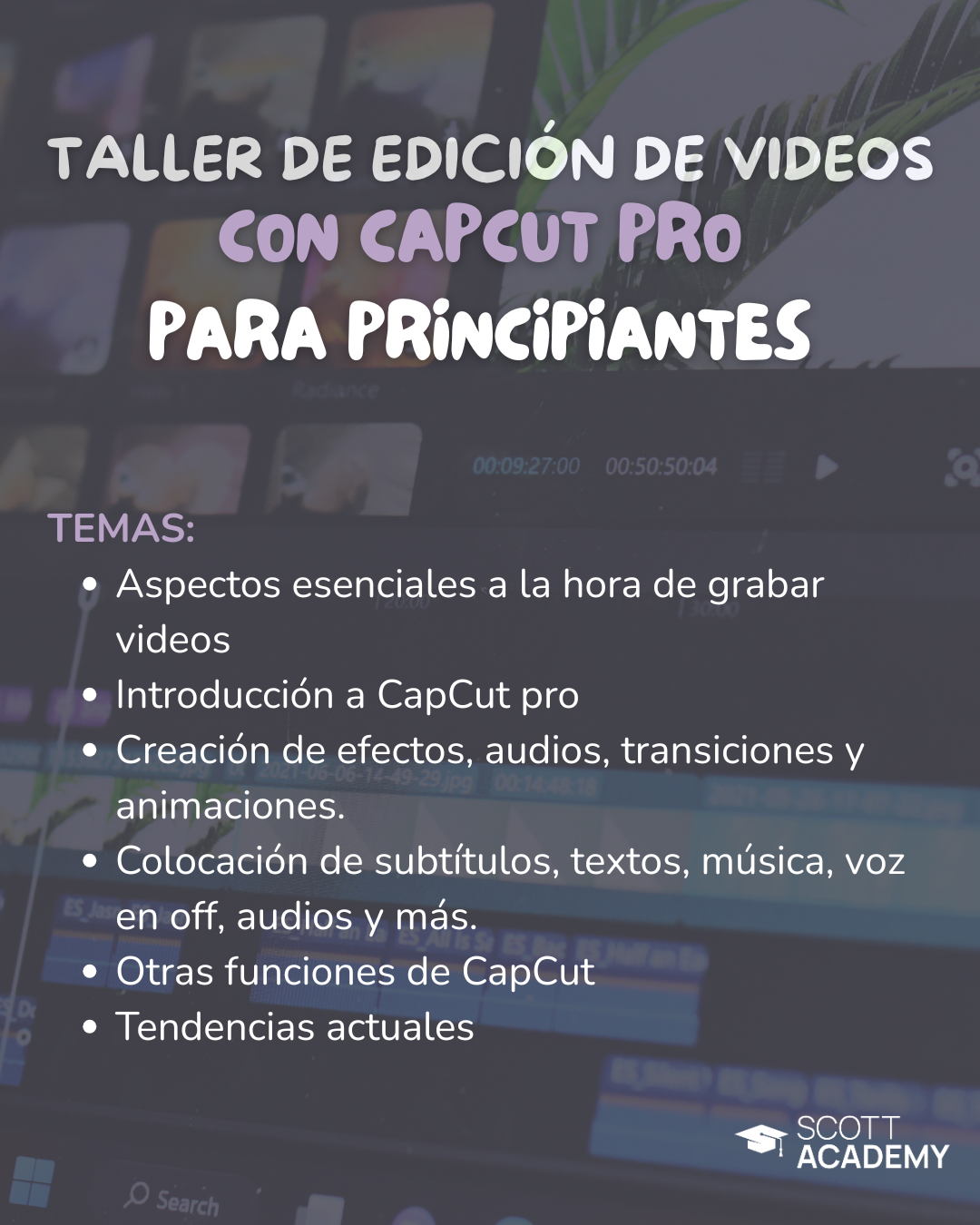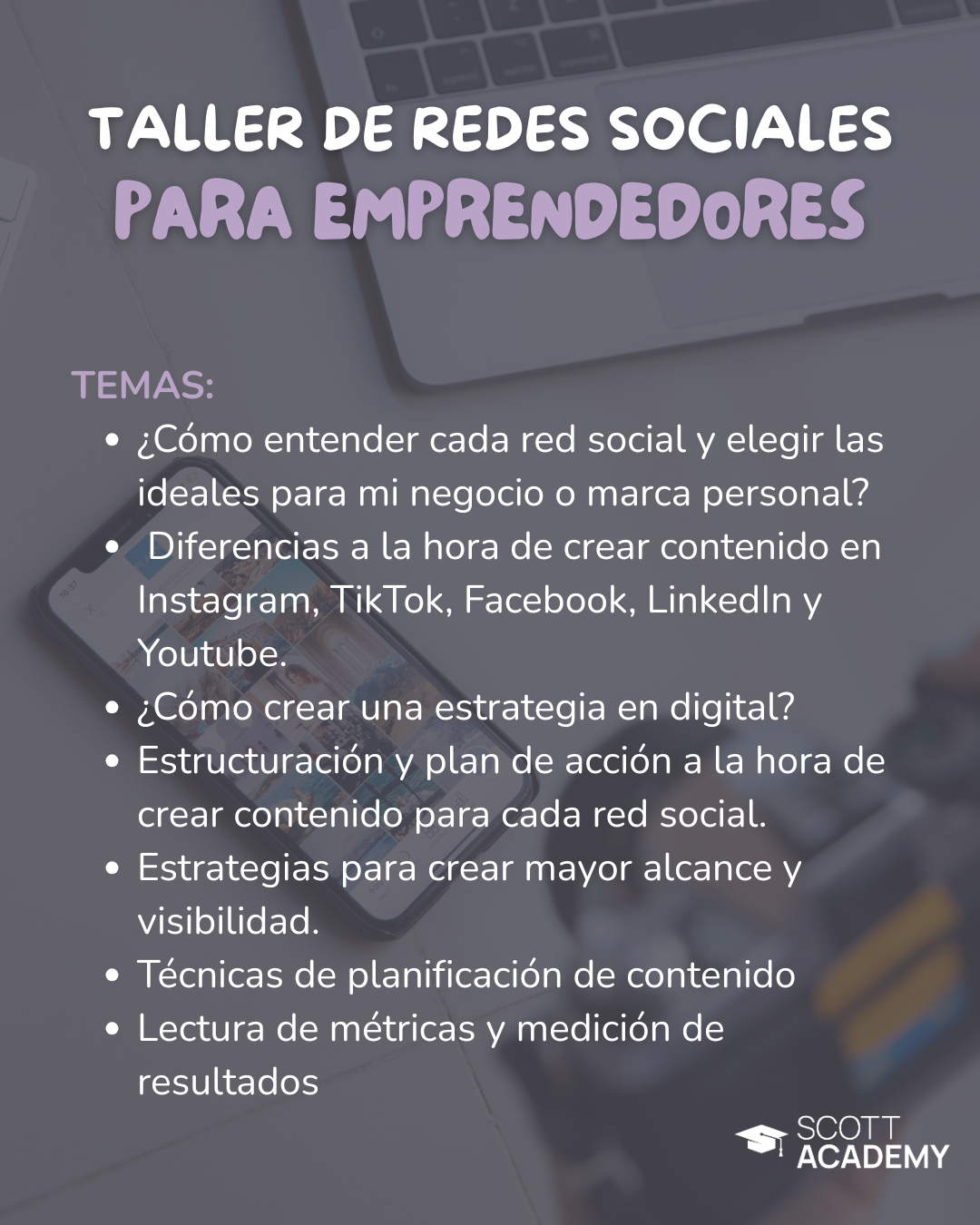 Los talleres se imparten de manera virtual según el calendario. Van variando mes a mes. Para más información y conocer próximas fechas, escríbenos al WhatsApp.